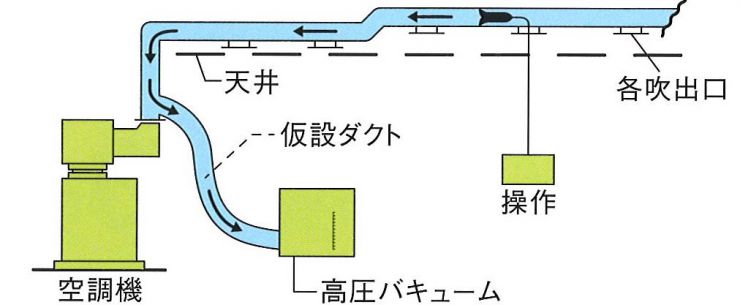 - ダクトの系列別に、ダクトの末端にエアーバキューム(粉塵気)を設置して、運転。